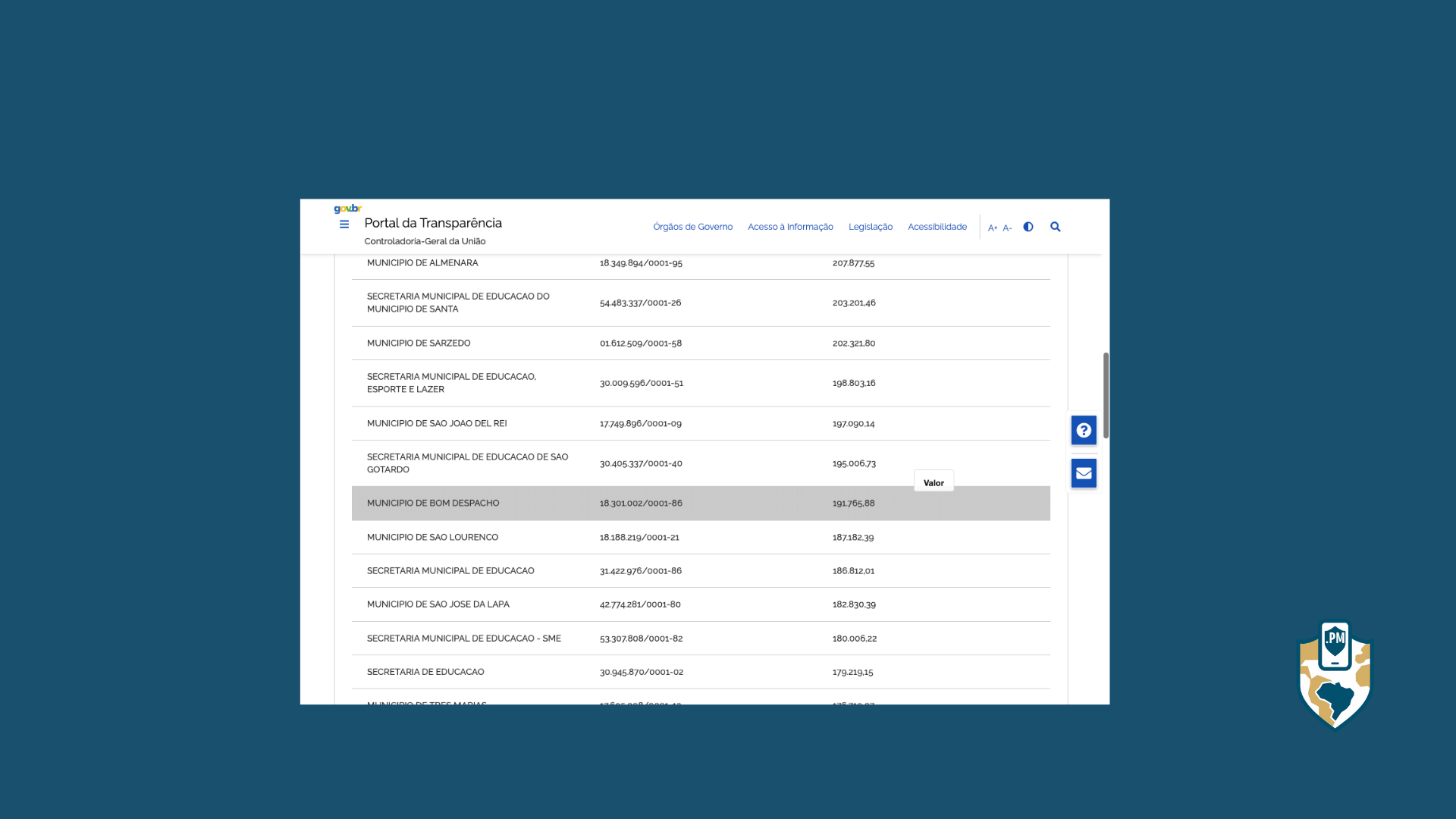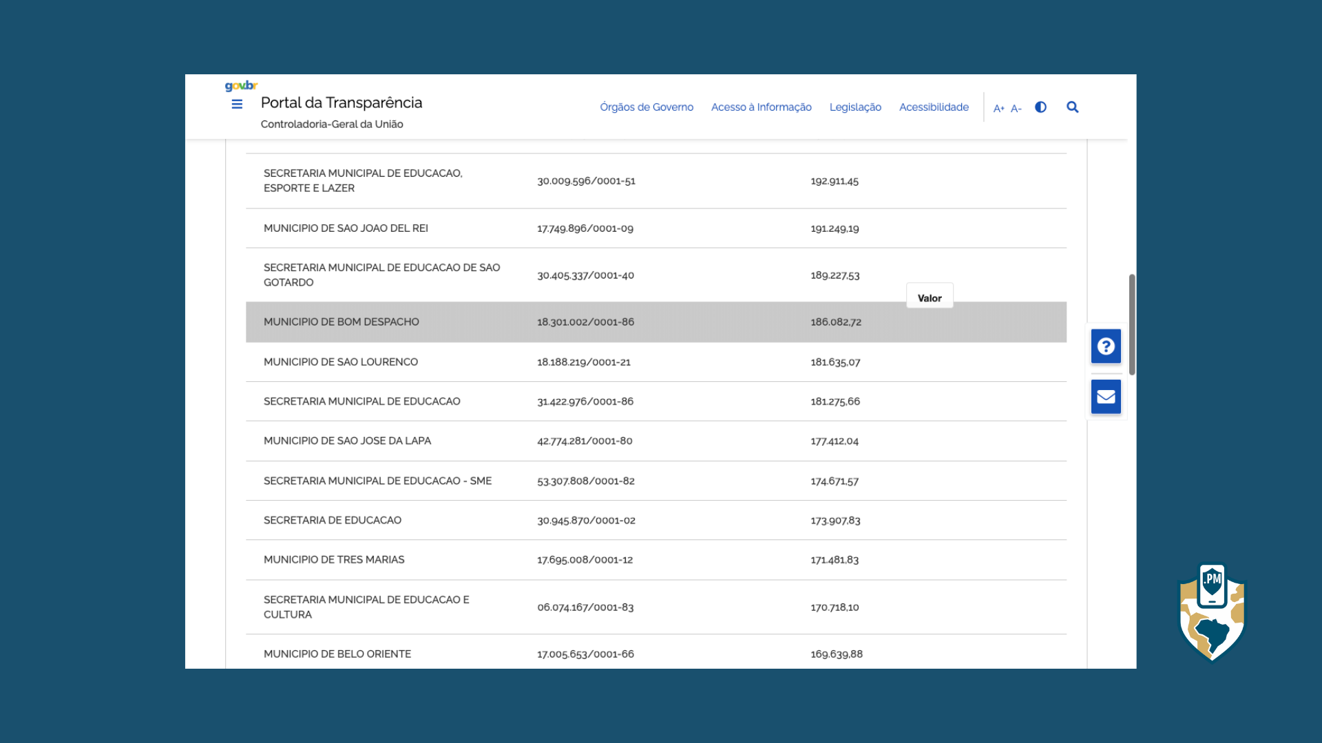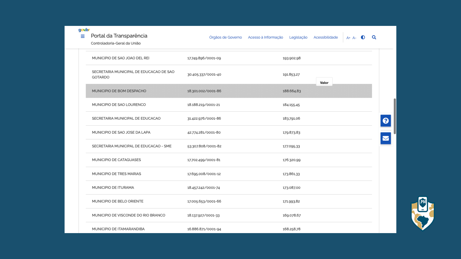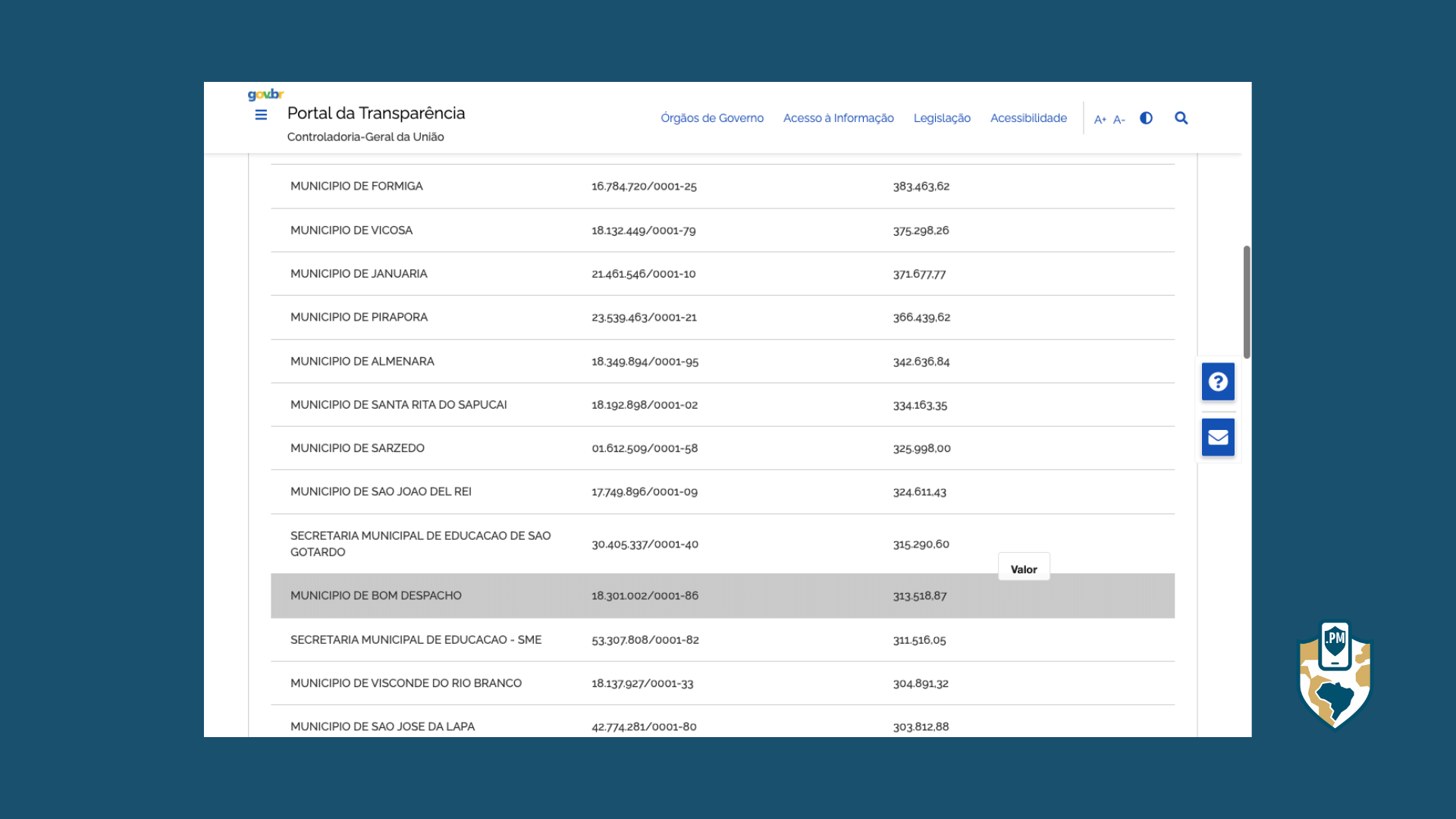 Do Portal da Transparência, em relação àquele órgão público, qualificado na Imagem 3, encontraram-se as informações de repasses de recursos financeiros ao Município de Bom Despacho. Neste ano de 2025, há registros de que, de janeiro a julho, foram repassados cerca de R$ 641.988.958,91 aos municípios brasileiros. A Bom Despacho distribuiu-se cerca de R$ 1.453.074,29, que obteve, salvo melhor juízo, recursos de outras fontes.