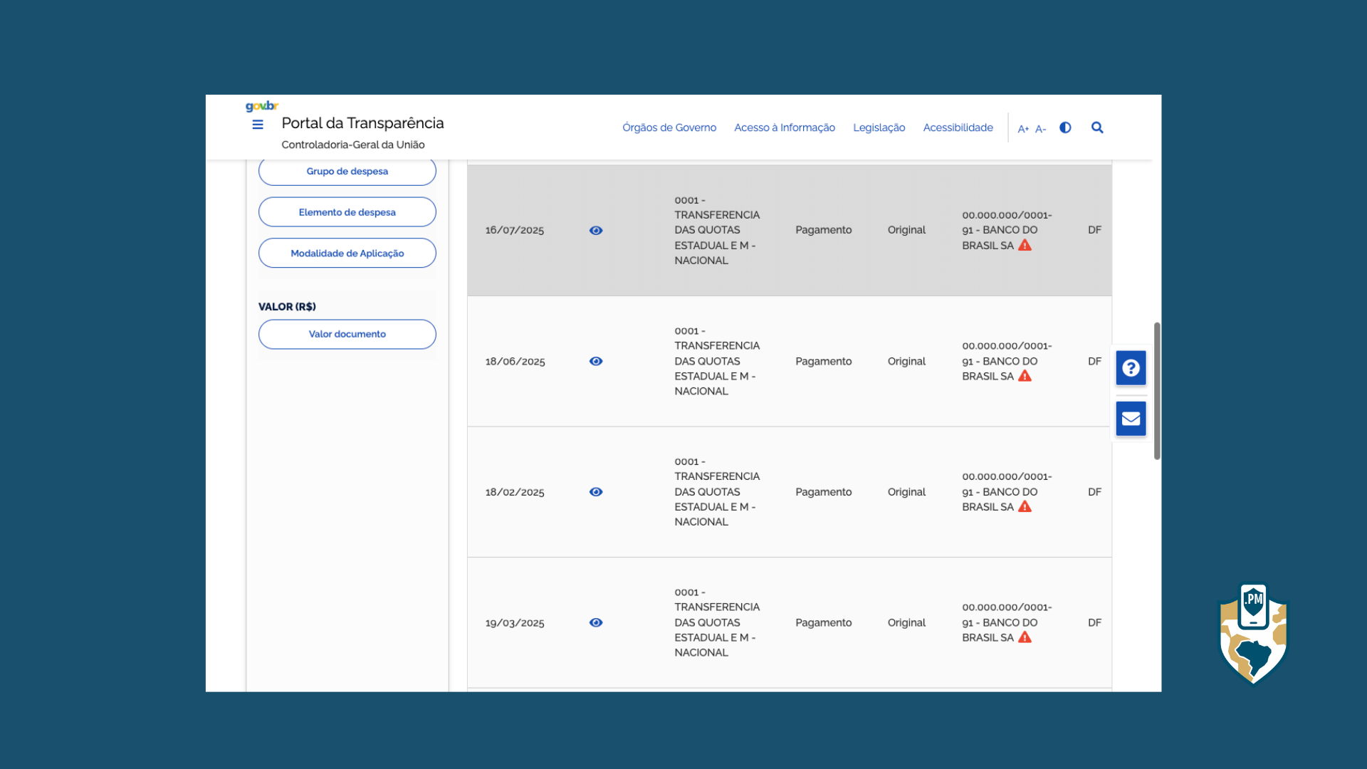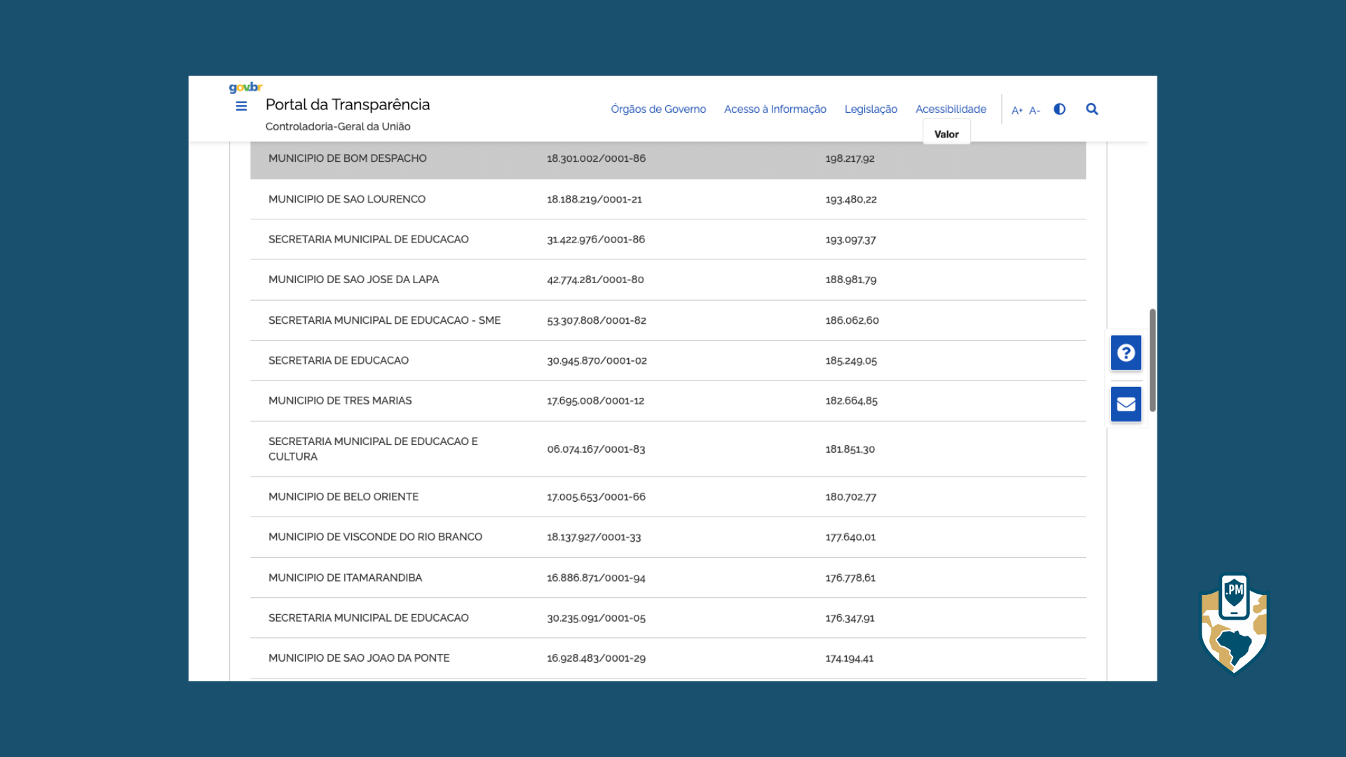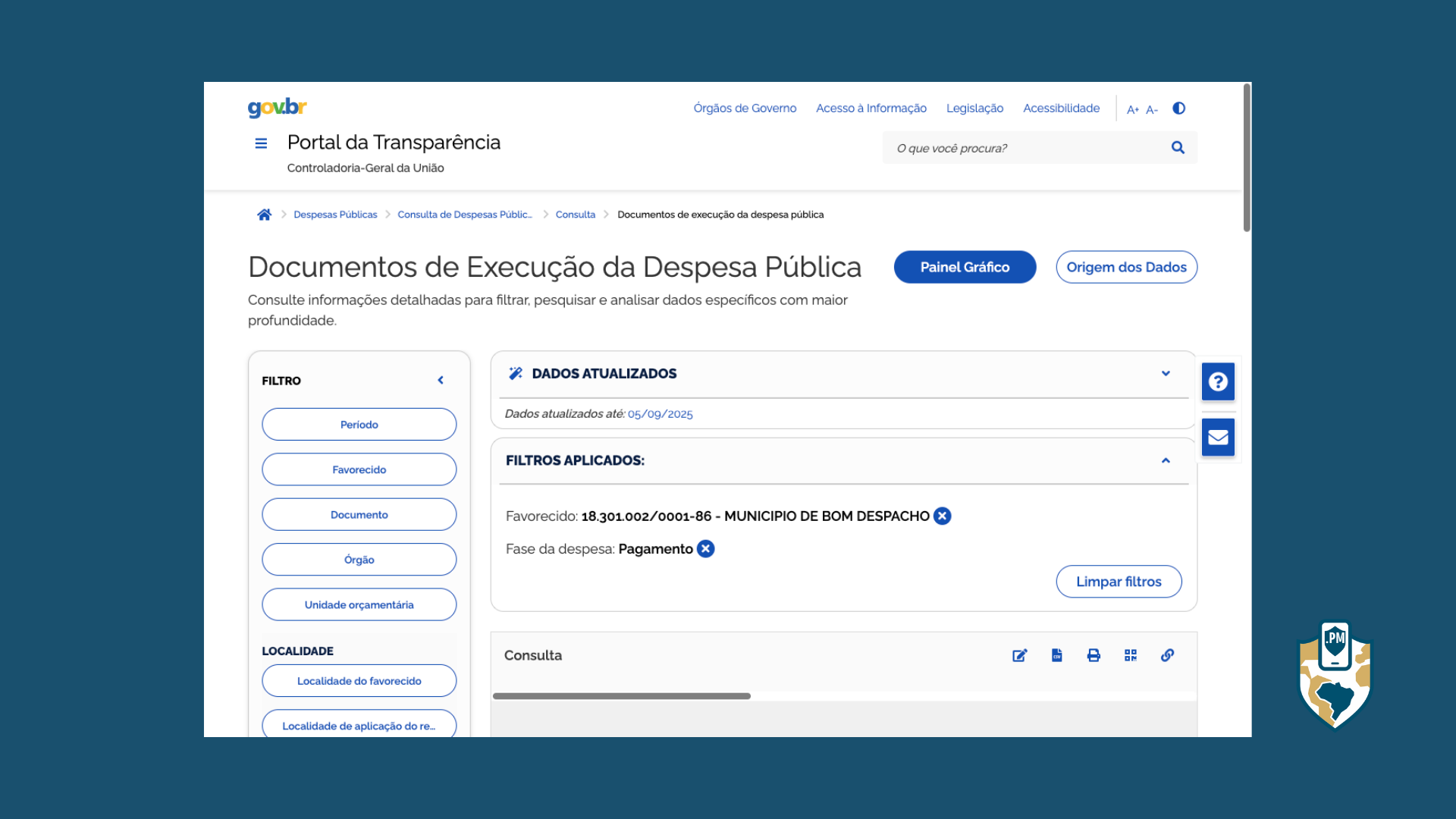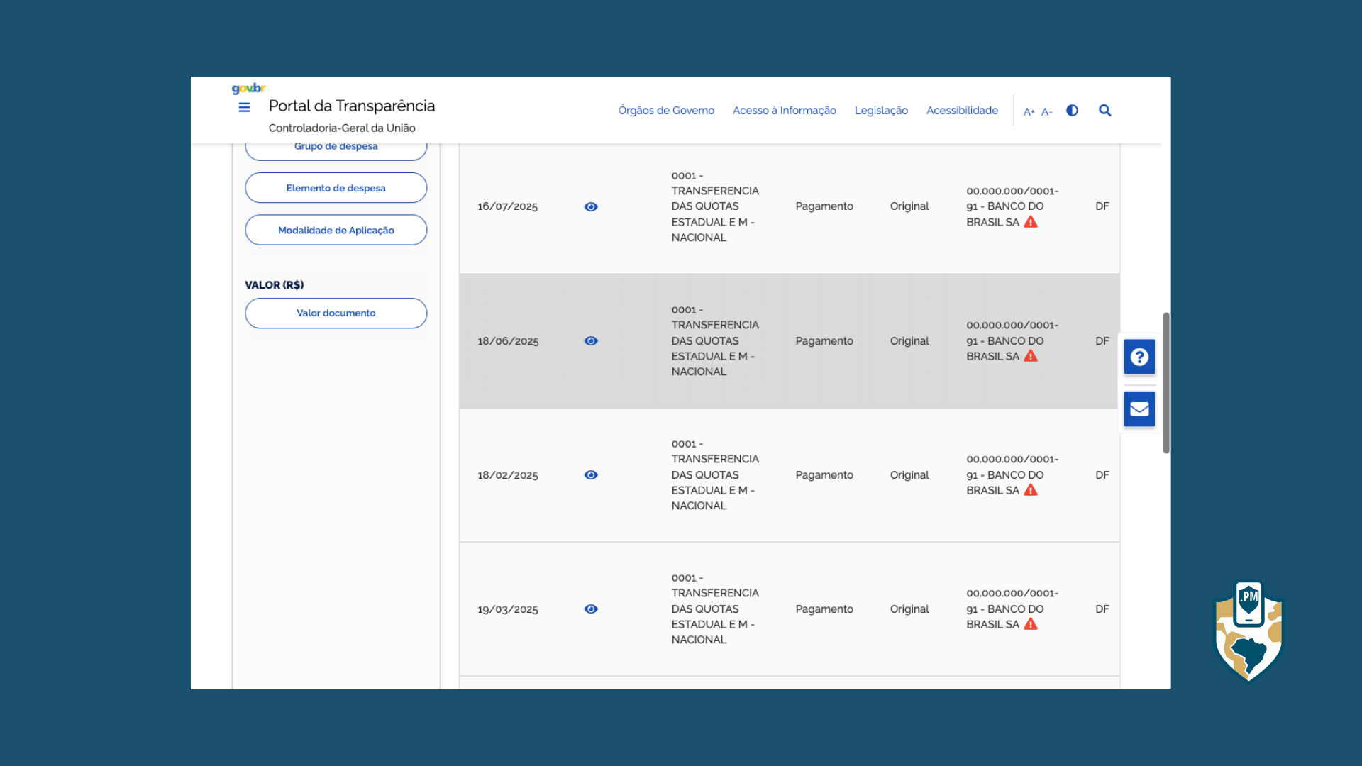 Do Portal da Transparência, em relação àquele órgão público, qualificado na Imagem 3, encontraram-se as informações de repasses de recursos financeiros ao Município de Bom Despacho. Neste ano de 2025, há registros de que, de janeiro a julho, foram repassados cerca de R$ 641.988.958,91 aos municípios brasileiros. A Bom Despacho distribuiu-se cerca de R$ 1.453.074,29, que obteve, salvo melhor juízo, recursos de outras fontes.