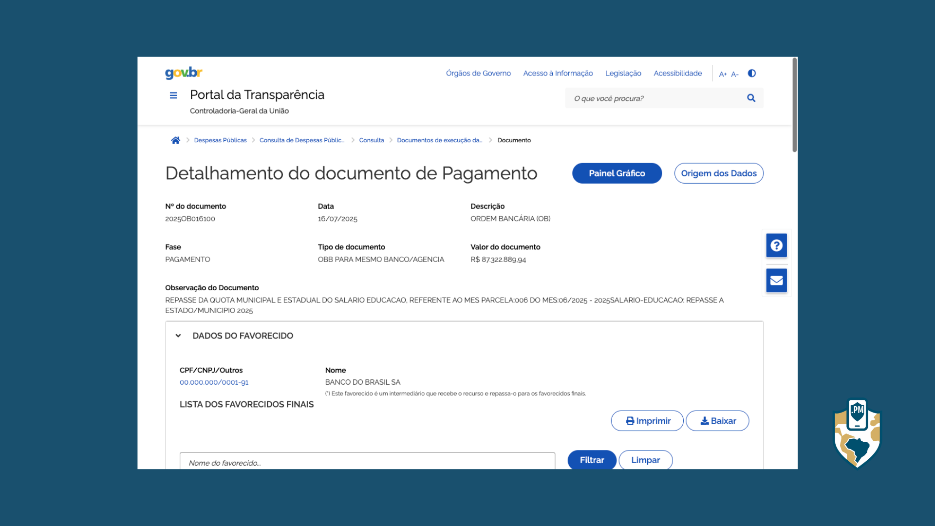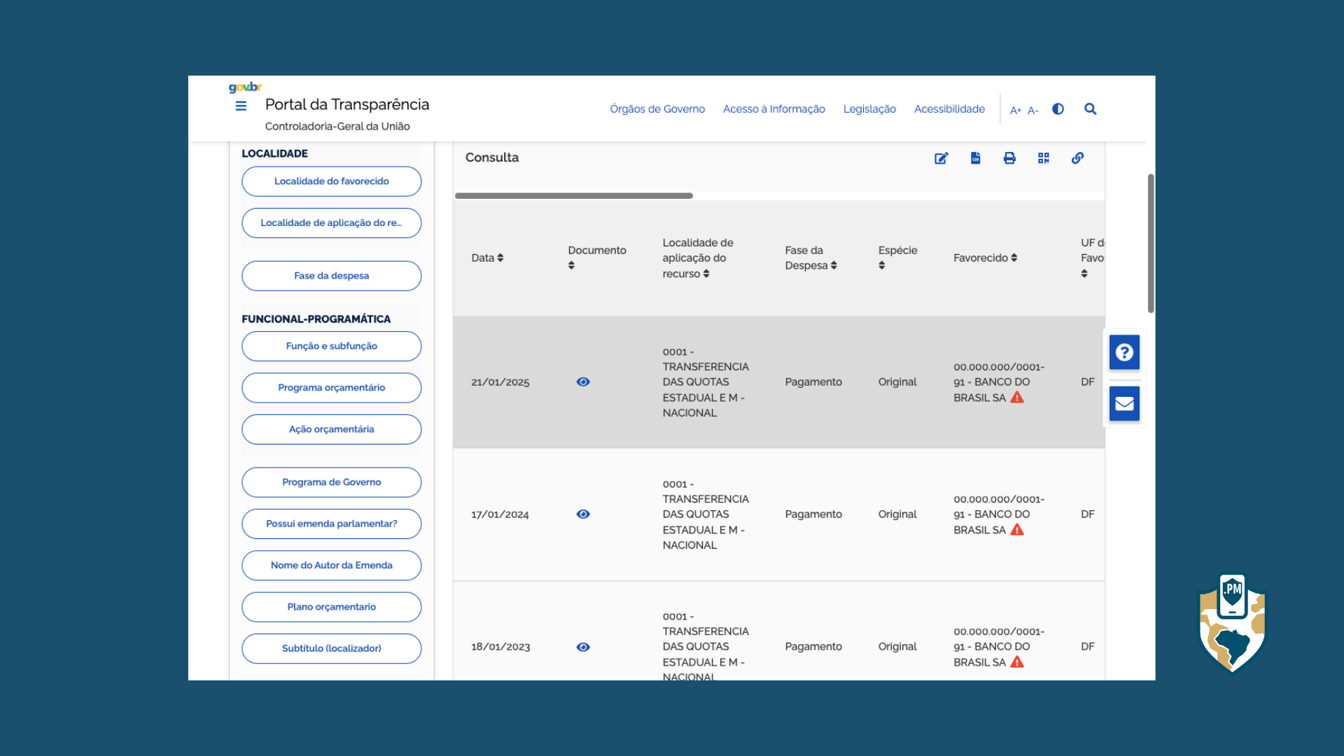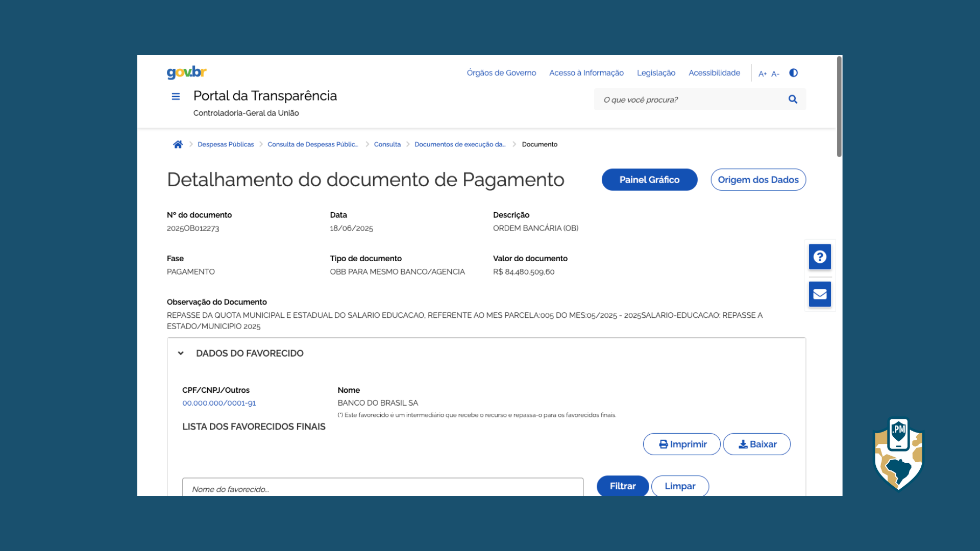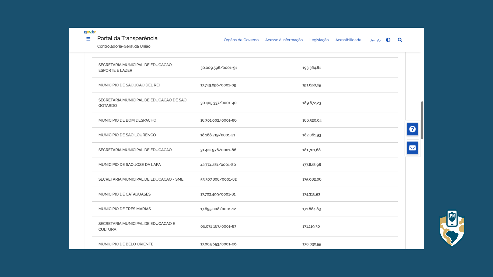 Do Portal da Transparência, em relação àquele órgão público, qualificado na Imagem 3, encontraram-se as informações de repasses de recursos financeiros ao Município de Bom Despacho. Neste ano de 2025, há registros de que, de janeiro a julho, foram repassados cerca de R$ 641.988.958,91 aos municípios brasileiros. A Bom Despacho distribuiu-se cerca de R$ 1.453.074,29, que obteve, salvo melhor juízo, recursos de outras fontes.