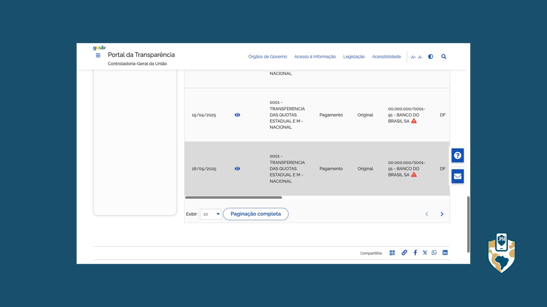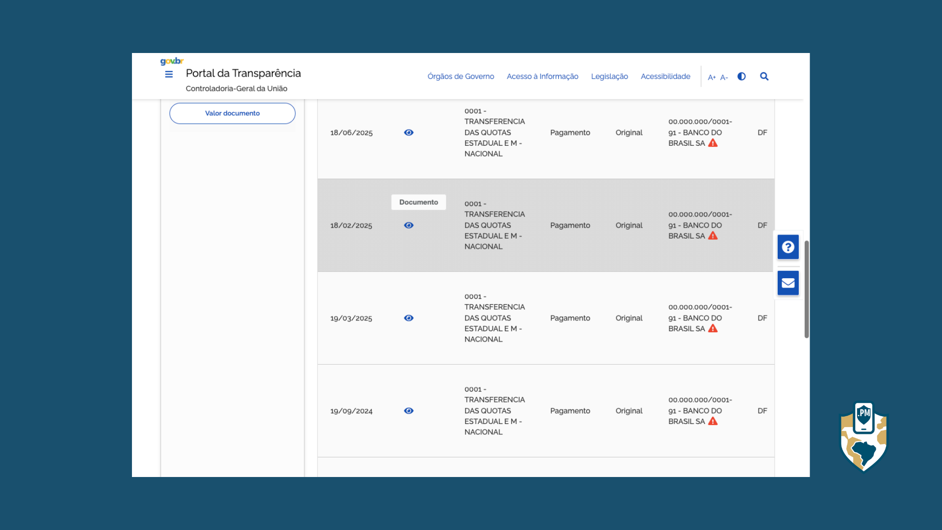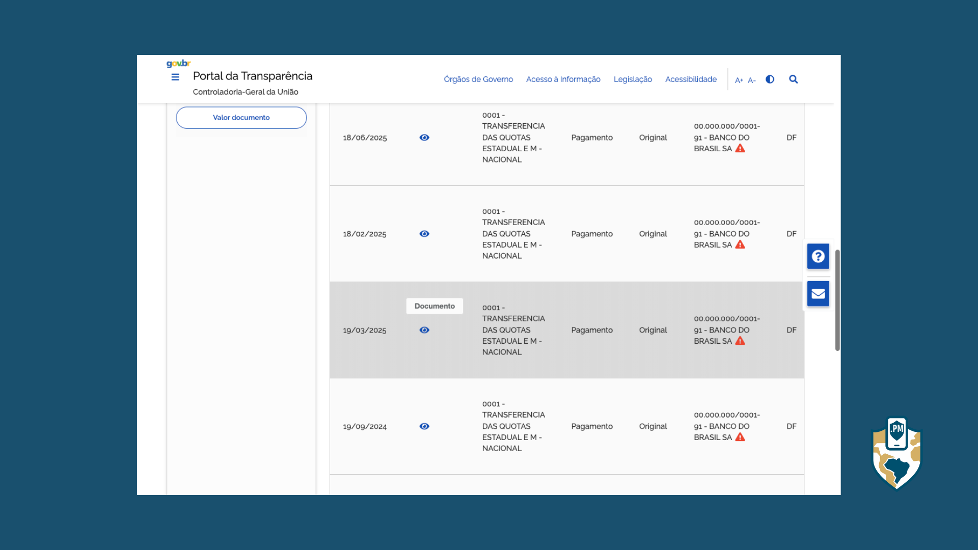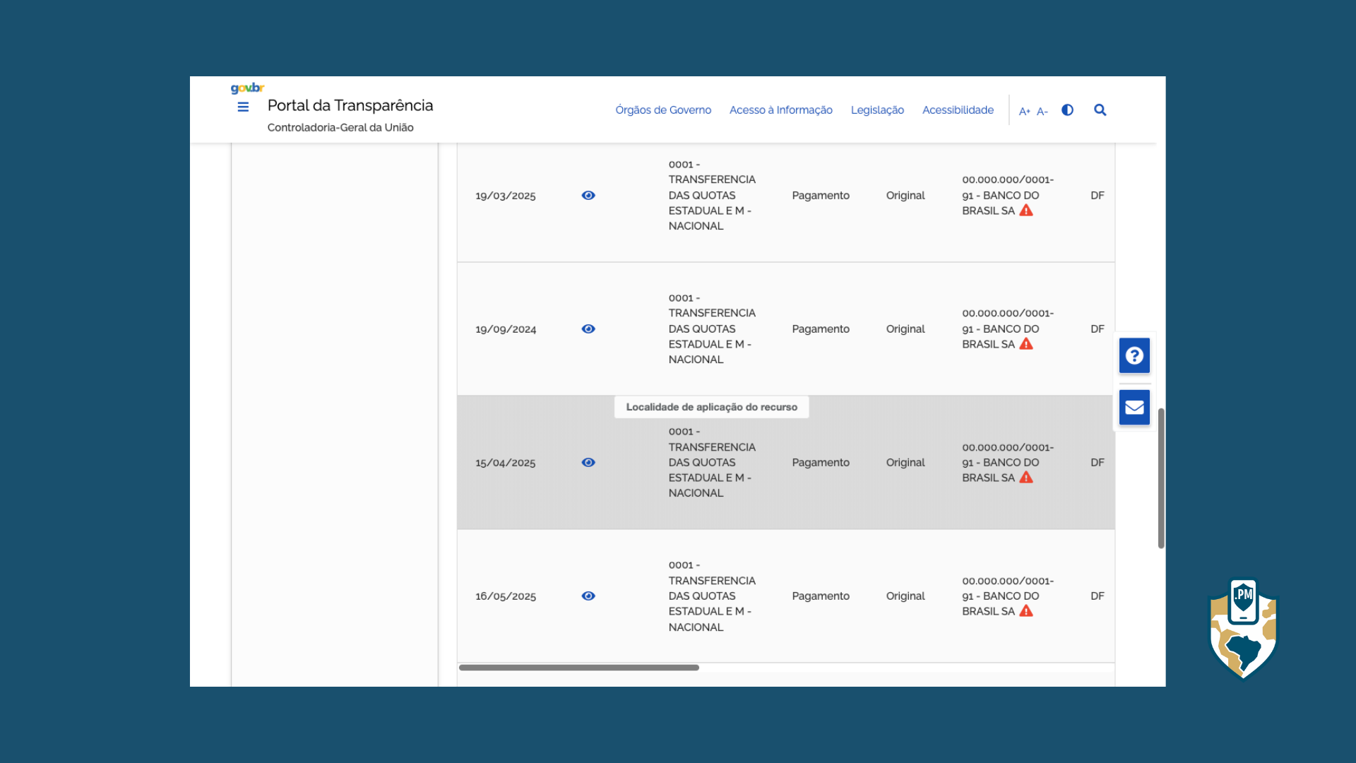 Do Portal da Transparência, em relação àquele órgão público, qualificado na Imagem 3, encontraram-se as informações de repasses de recursos financeiros ao Município de Bom Despacho. Neste ano de 2025, há registros de que, de janeiro a julho, foram repassados cerca de R$ 641.988.958,91 aos municípios brasileiros. A Bom Despacho distribuiu-se cerca de R$ 1.453.074,29, que obteve, salvo melhor juízo, recursos de outras fontes.