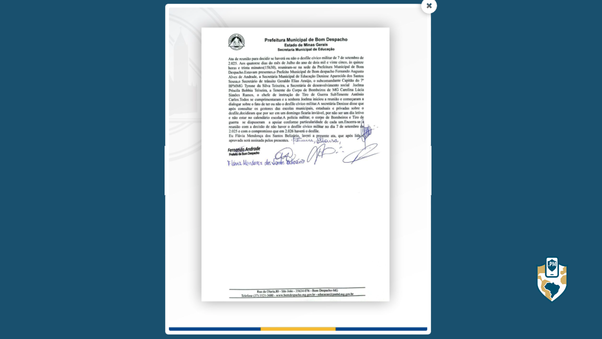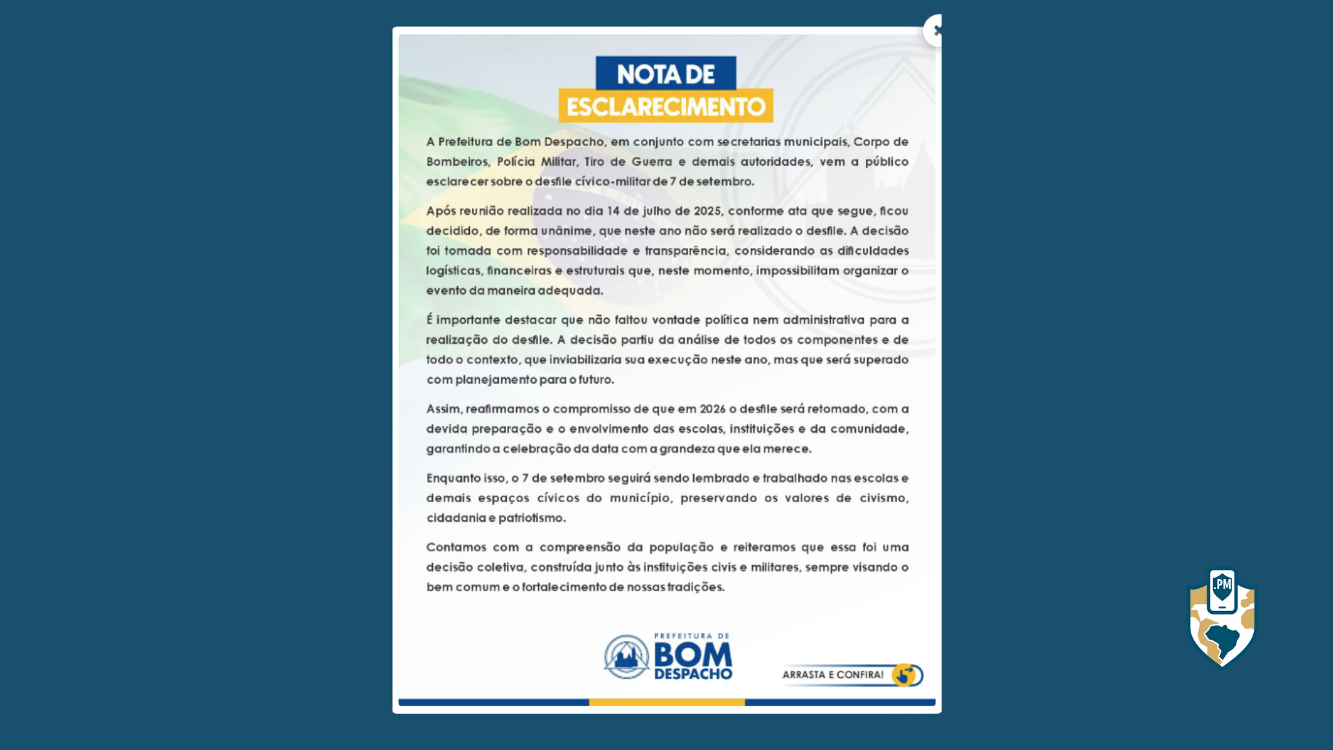 “[…] esclarece sobre o desfile-cívico militar de 7 de setembro […]”, decidido em “[…] reunião realizada no dia 14 de julho, conforme ata que se segue […]. A decisão foi tomada com responsabilidade e transparência, considerando as dificuldades logísticas, financeiras e estruturais que, nesse momento, impossibilita organizar o evento da maneira adequada […]”.