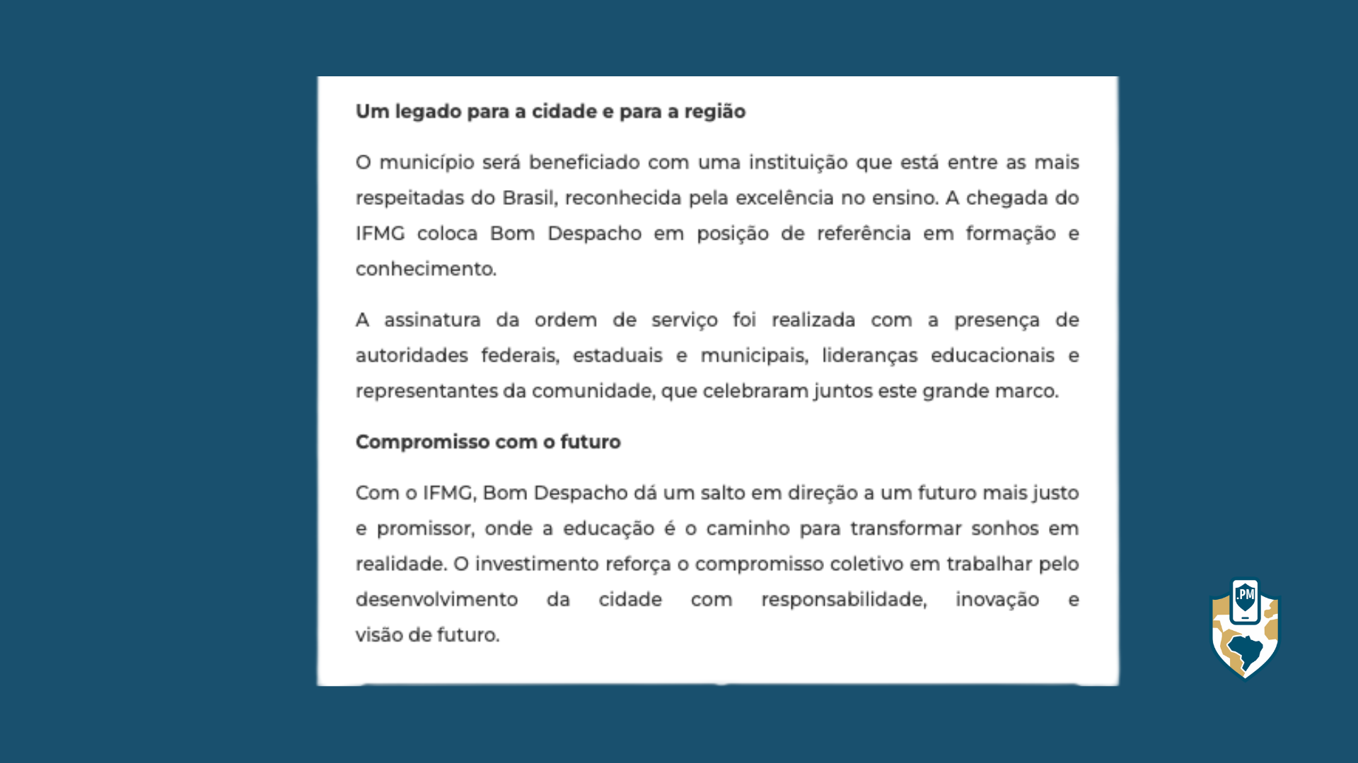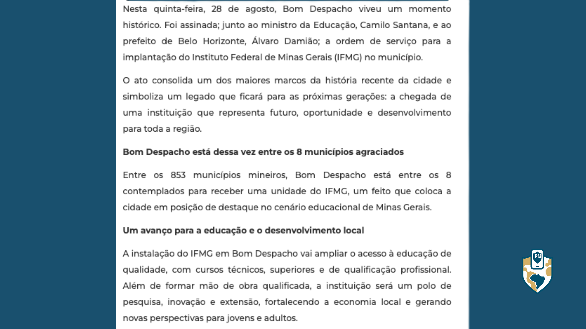 Na ante semana antecedente ao 7 de Setembro, o site de Bom Despacho publicou notícia, com imagens (de ambiente interno), indicando ter sido assinado, com a União, a “Ordem de Serviço para implantação de Instituto Federal de Minas Gerais (IFMG)”. Tudo indica que o evento político não deveria ter a publicidade e a merecida celebração, a despeito das presenças de “[…] autoridades federais, estaduais e municipais, lideranças educacionais e representantes da comunidade […]”. Não se entendeu porque não foi um evento mais público, pois, dele emerge a expectativa do recebimento de mais recursos públicos ao Município de Bom Despacho.