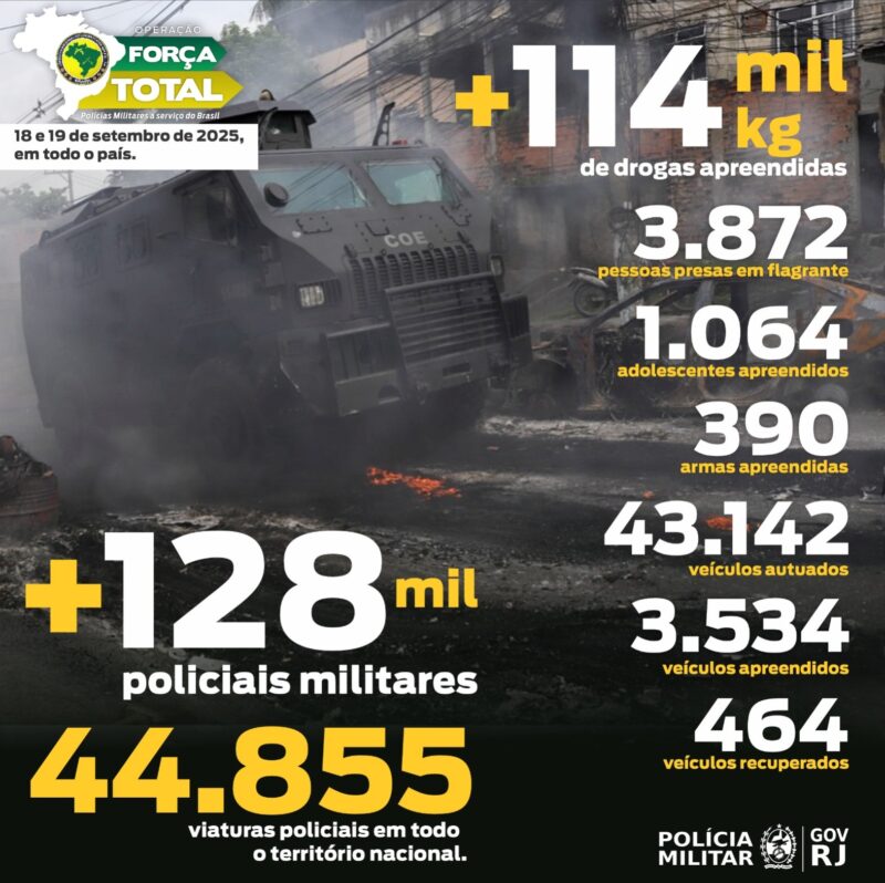 Outra vez, o Conselho Nacional de Comandantes-Gerais de Polícia Militar (CNCGPM) apresentou, no Rio de Janeiro, em 29 de outubro de 2025, o balanço da 19ª edição da Operação Força Total. Resultante dos esforços das Polícias Militares brasileiras – implementados simultaneamente em todo o território nacional, no período de 18 a 19 de setembro de 2025 –, a partir do emprego de 128 mil policiais militares, aproximadamente.