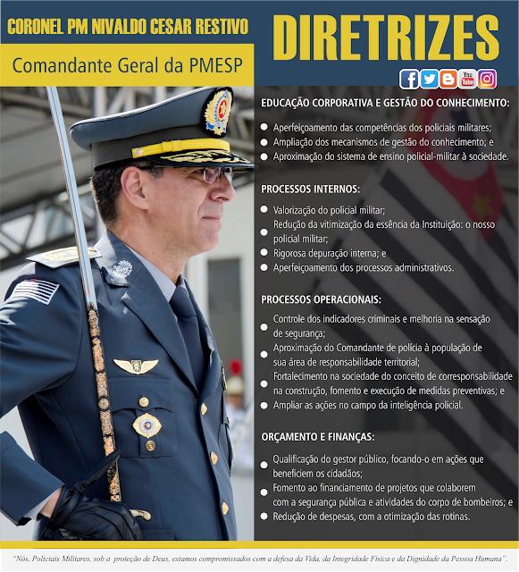 No primeiro dia útil do seu comando, o Coronel PM Nivaldo Cesar Restivo — Comandante Geral da Polícia Militar do Estado de São Paulo — fez publicar, nas redes sociais da Instituição Militar Estadual, as diretrizes para a ação de comando.